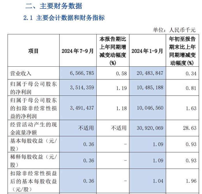 报告期内,该行实现营收204.8亿元,同比增长0.34%;归母净利润为104.9亿元,同比增长0.81%。第三季度营收为65.67亿元,同比增长0.58%;归母净利润为35.14亿元,同比增长1.19%。