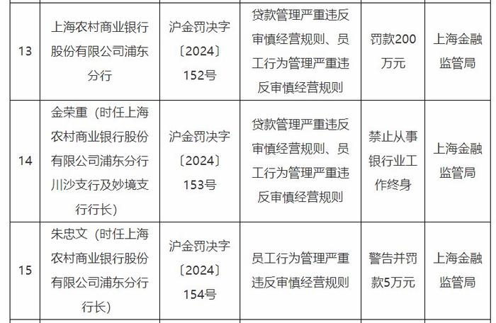 罚单披露,沪农商行浦东分行因“贷款管理严重违反审慎经营规则、员工行为管理严重违反审慎经营规则”,被罚款200万元。时任沪农商行浦东分行川沙支行及妙境支行行长金荣重,被禁止从事银行业工作终身;时任沪农商行浦东分行行长朱忠文被警告并罚款5万元。贷款管理涉及银行的核心业务,违反审慎经营规则可能使银行面临更高的信贷风险,如不良贷款率上升等。员工行为管理的失控则可能滋生内部腐败、违规操作等风险,进而影响银行的整体运营与声誉。