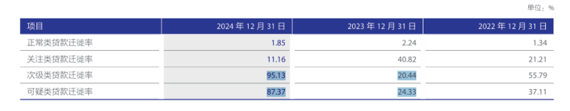 与此同时,可以看到,上海农商行次级类、可疑类贷款迁徙率大幅上升。