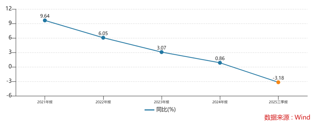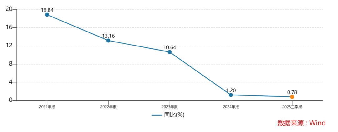 Wind数据显示,2021-2024年,沪农商行的营收增速从9.64%逐年下滑至0.86%;归母净利润增速更是从18.84%“断崖式”跌至1.20%,2025年三季度的0.78%增速进一步逼近零增长红线。