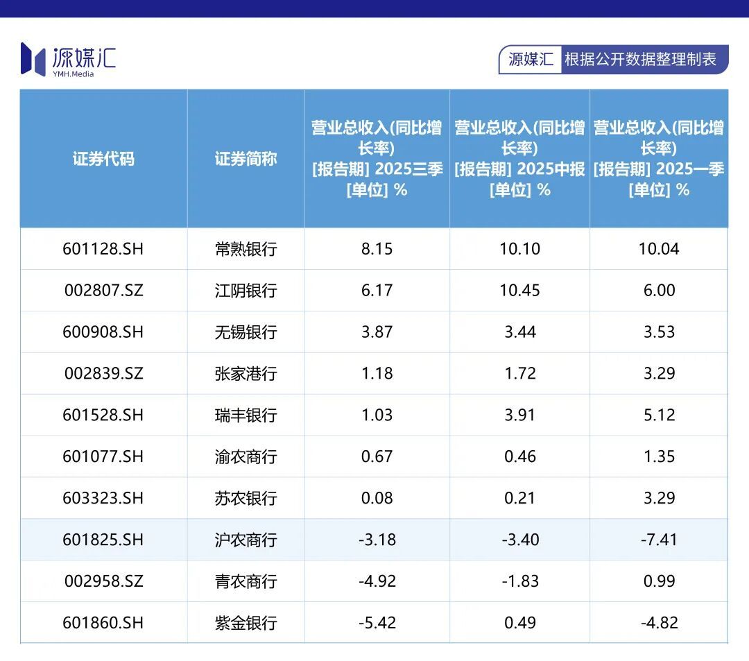 2025年一季度,沪农商行的营收同比下降7.41%,上半年同比下降3.40%,前三季度降幅收窄至3.18%,看似回暖,实则在10家A股上市农商行中排名垫底,成为唯一连续三个报告期营收负增长的A股上市农商行。