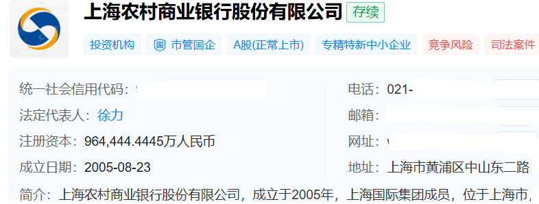 天眼查显示,沪农商行成立于2005年8月23日,注册资本为96.44亿元,法定代表人是徐力,其亦是该行董事长。
