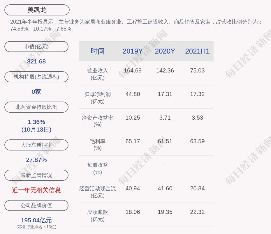 2021年半年报显示,美凯龙的主营业务为家居商业服务业、工程施工建设收入、商品销售及家装,占营收比例分别为:74.56%、10.17%、7.65%。