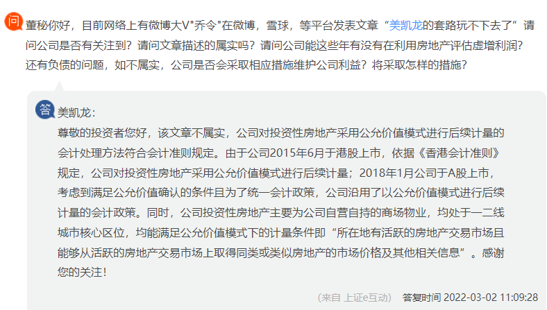 此前,网络上有微博大V"乔令"发表文章,指出红星美凯龙通过公允价值计量方法,利用房地产评估虚增利润。当时美凯龙回应称,该文章不属实,公司对投资性房地产采用公允价值模式进行后续计量的会计处理方法符合会计准则规定。