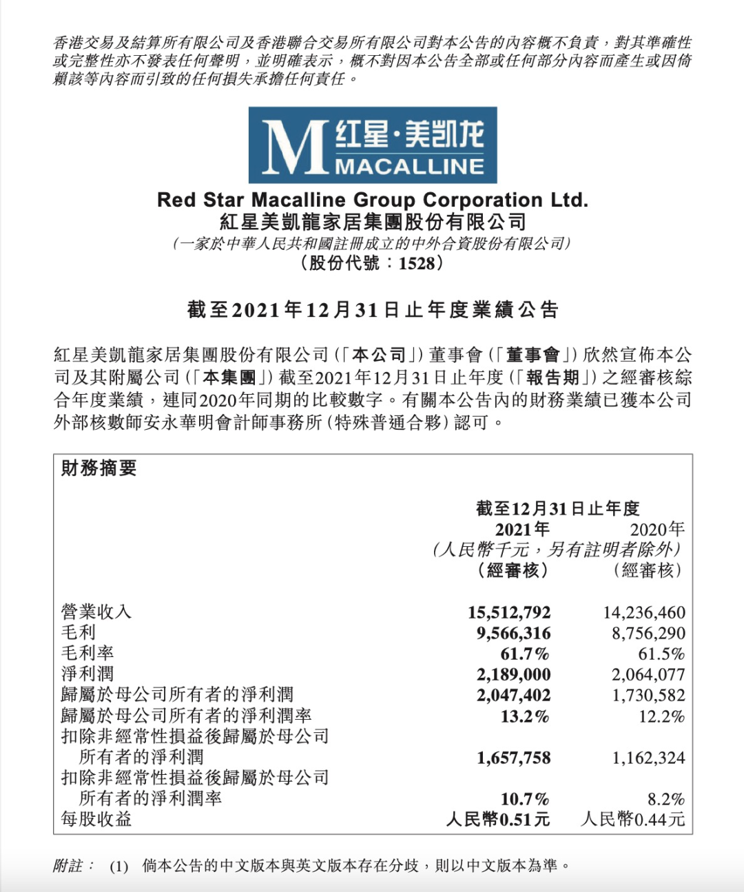 红星美凯龙刚刚发布的2021年报显示,去年公司实现营收155.1亿元,同比增长9.0%;归母净利润达20.5亿元,同比增长18.3%;扣非后归母净利润达16.6亿元,同比增长42.6%;基本每股收益达0.51元,同比增长15.9%。