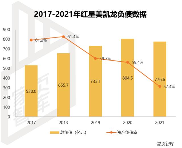 不断断臂求生,确实给红星美凯龙带来了一定的喘息空间。根据红星美凯龙2021年业绩公告显示,截至期末,红星美凯龙资产负债率比2020年下降1.94%,至57.44%。