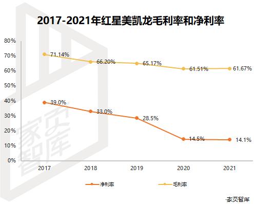 而与这种营收颓势相呼应的,则是红星美凯龙毛利率和净利率的连年下降。2021年,红星美凯龙毛利率61.67%,在经历连续五年下滑后略微反弹,净利率14.11%,则是连续第六年下滑。