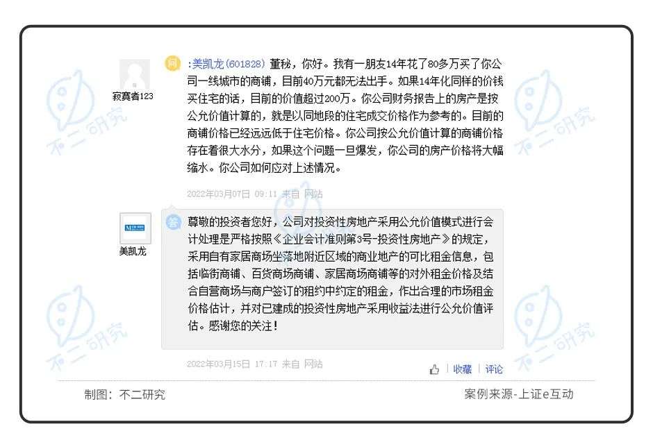 投资性房地产公允价值所产生的利润大幅下降,也是红星美凯龙利润下滑的重要原因之一。另外,「不二研究」认为,若将此项科目还原至现实,其逻辑却经不起推敲,近两年商业地产低迷,唱空文章随处可见。3月7日,有投资者于上证e互动表示曾花80万买的红星美凯龙商铺目前40万都无法出手,对其房产公允价值变动额提出质疑。