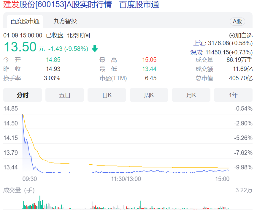 然而,资本市场似乎并不看好这笔交易。1月9日早间开盘后,建发股价连续下跌,一度跌停。截至收盘,建发股价报13.50元/股,跌幅达9.58%,市值蒸发43亿元。