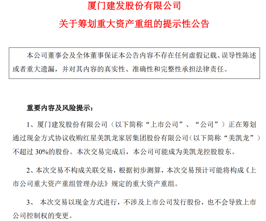 1月8日,建发股份发布公告称,公司正筹划通过现金方式协议收购红星美凯龙控股集团有限公司(以下简称美凯龙)不超过30%的股份。本次交易完成后,建发可能成为美凯龙的控股股东。