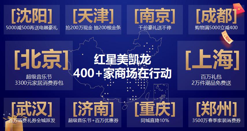 而除了全国层面的重磅投入,红星美凯龙全国重点城市及400多个商场也“遍地开花”。例如,北京会举办音乐节,郑州会有3500万家居消费券派发,成都、重庆也会有满减活动以及同城直降活动,天津更是送出了200多条黄金作为“3.15”活动的权益放送。