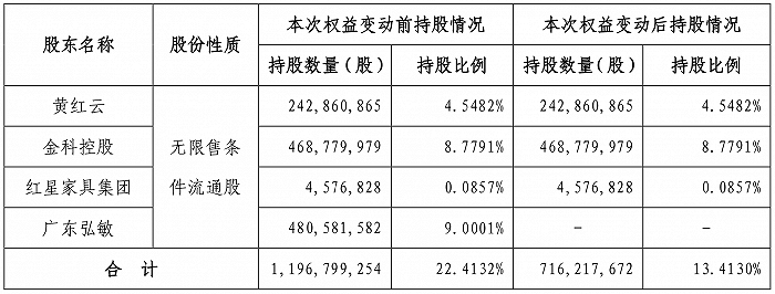 根据公开信息,广东弘敏站队金科股份实控人黄红云。若上述拍卖达成,则金科股份控股股东重庆市金科投资控股(集团)有限公司、黄红云及一致行动人红星家具集团有限公司(以下简称“红星家具集团”)、广东弘敏合计持有公司股份将由11.97亿股变更为7.16亿股,占公司总股本的13.4130%。