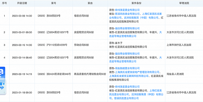 红星控股呢?公开报道有一些数据可参考,截至2022年6月底货币资金约为87.57亿元,同期短期借款及一年内到期的非流动负债共约252.5亿元。2022年11月,红星控股旗下债券“20红星05”宣布展期。红星控股2023年来作为被告开庭公告有6个,其中有借款合同纠纷。