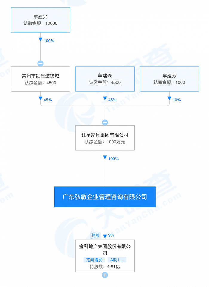 实际上广东弘敏由红星家具集团100%持股,站在背后的正是车建兴。