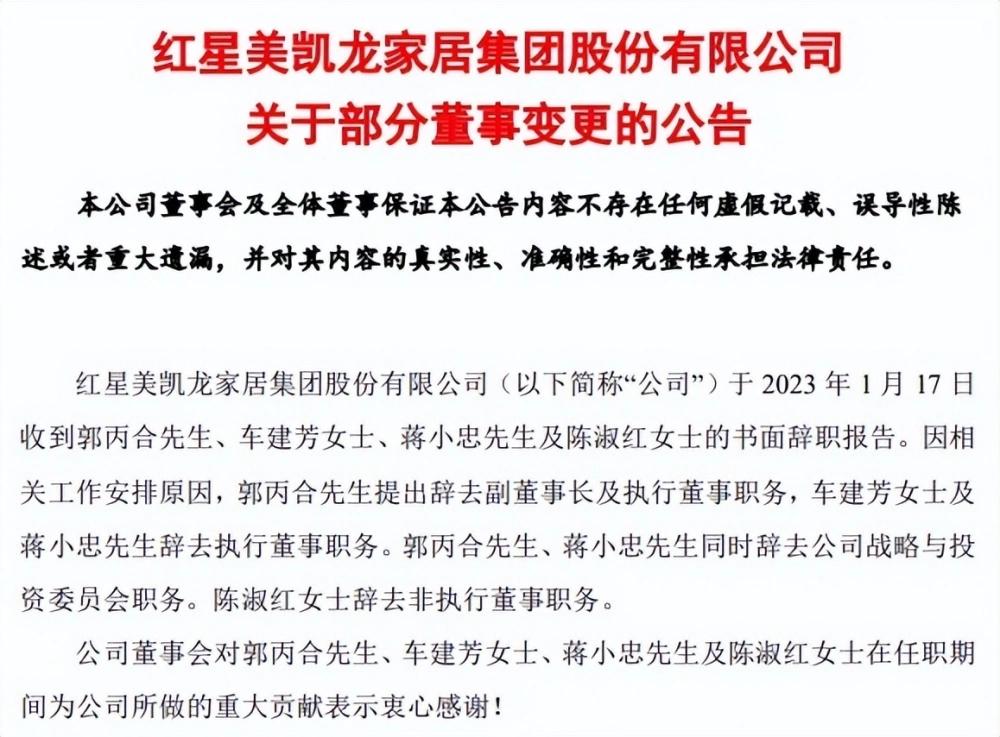 而根据界面的报道,美凯龙董事长车建兴在2023年1月末的公司“目标责任大会上”明确表示,他将会让出董事长职务,但仍将担任公司总经理、CEO。