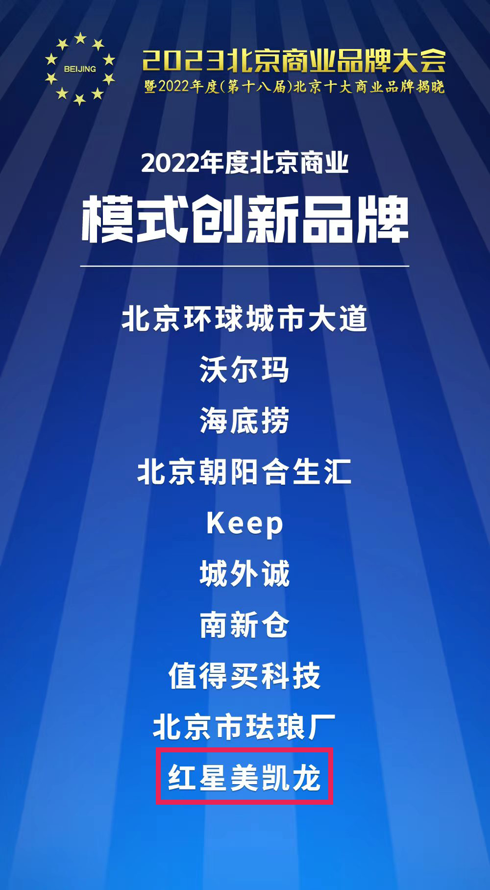 2023年2月21日,由北京市商务局指导,北京日报报业集团、北京市商业联合会主办,北京商报社承办的2023北京商业品牌大会暨2022年度(第十八届)北京十大商业品牌揭晓活动,在北京国际饭店会议中心隆重举行。红星美凯龙与北京环球城市大道、沃尔玛、海底捞、北京朝阳合生汇、Keep、城外诚、南新仓、值得买科技、北京市珐琅厂一道,荣获“2022年度北京商业模式创新品牌”。