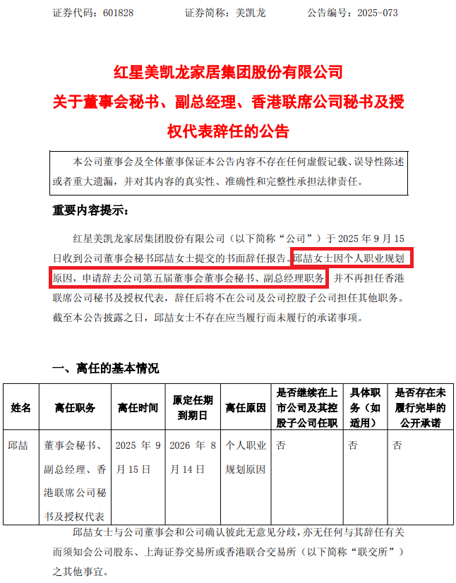 上交所主板上市公司美凯龙(601828.SH)于2025年9月16日发布了《关于董事会秘书、副总经理、香港联席公司秘书及授权代表辞任的公告》。公告显示,邱喆女士因个人职业规划原因,申请辞去公司第五届董事会董事会秘书、副总经理职务、并不再担任香港联席公司秘书及授权代表,辞任后将不在公司及公司控股子公司担任其他职务。