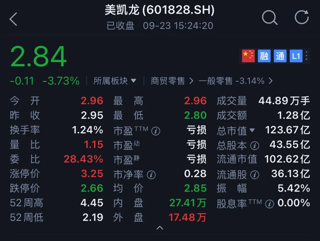 23日,美凯龙(601828.SH)以2.96元/股的价格高开,随后走低,一路下探,截至收盘跌3.73%,对应股价2.84元/股,总市值123.67亿元。
