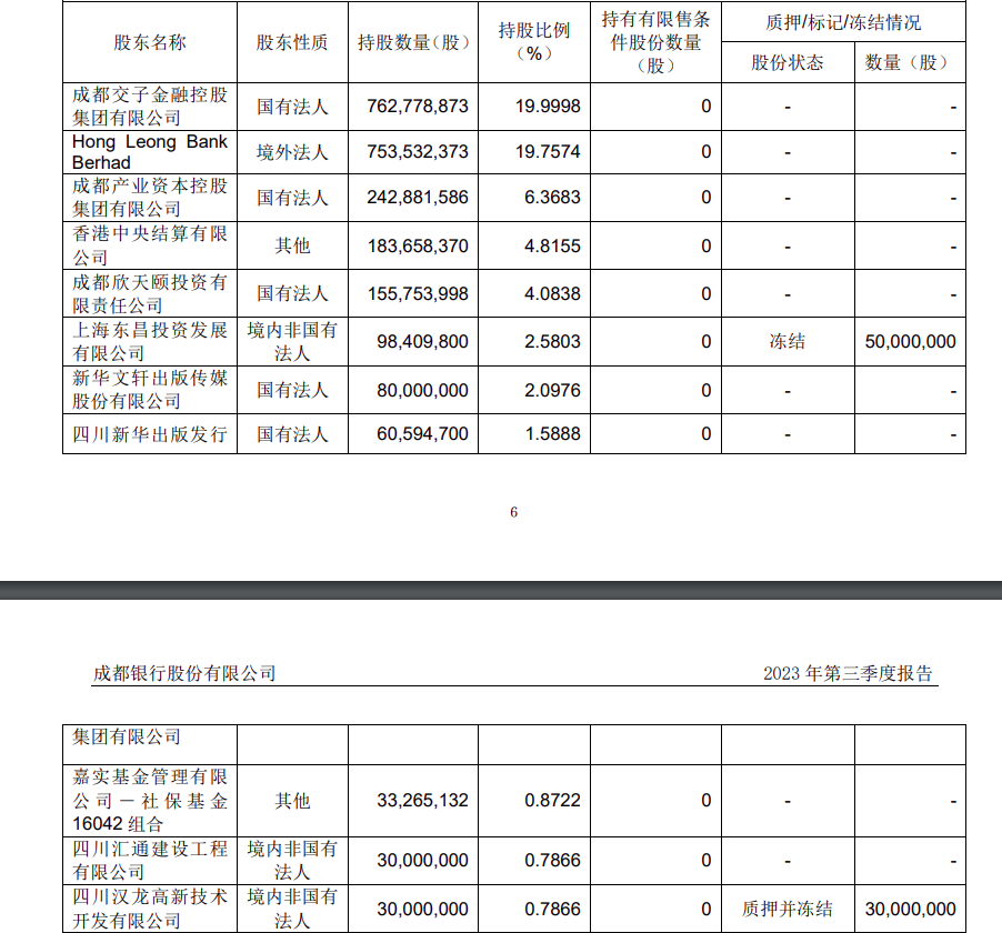 截至2023年三季报,东昌投资为成都银行持股2.58%的第六大股东,持股数量达9840.98万股,其中有5000万股股份处于冻结状态。