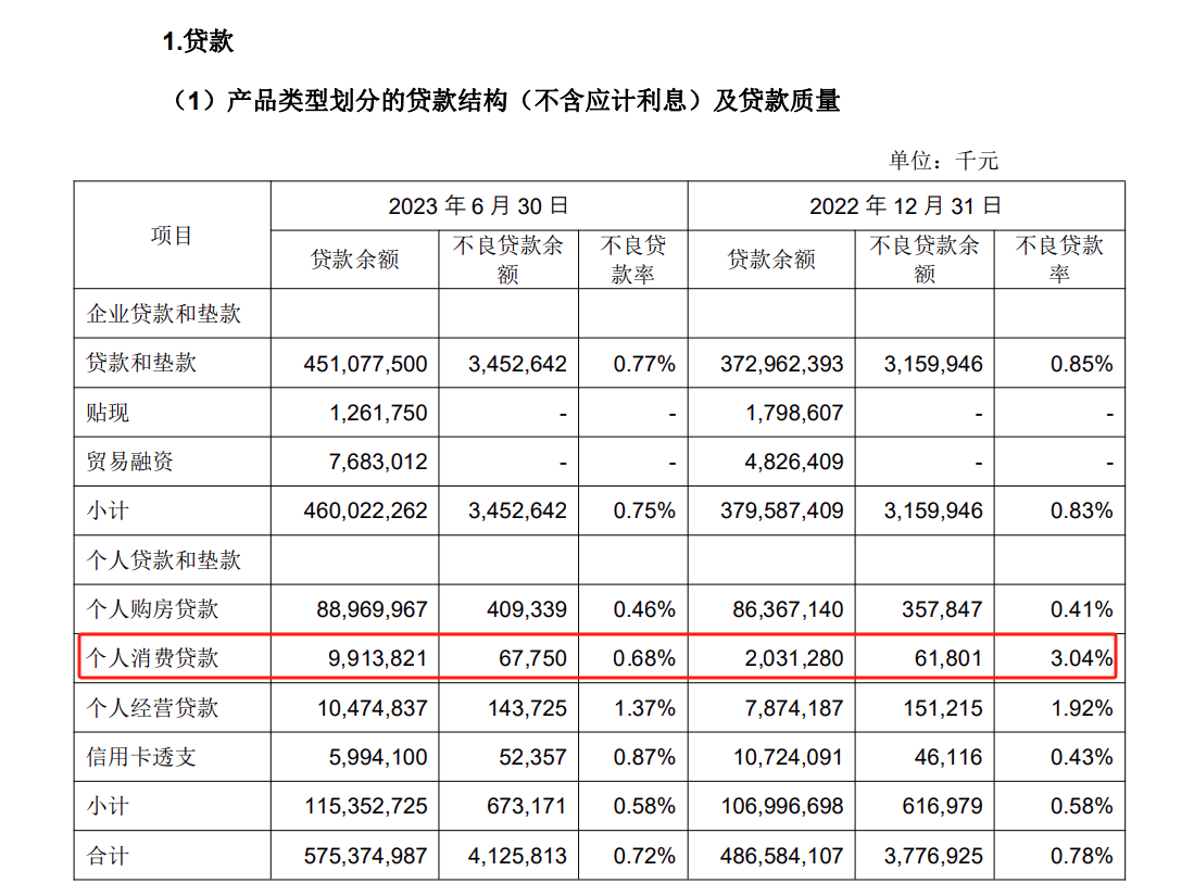个人消费贷款是国有大行的“心头好”之一,成都银行自2018年起公布个人消费贷款的不良贷款率。截至2023年6月末,该行个人消费贷款余额为99.14亿元,不良贷款余额为6775万元,不良贷款率0.68%。而2022年12月底,个人消费贷款余额为20.31亿元,不良贷款余额和不良率分别是6180万元、3.04%。