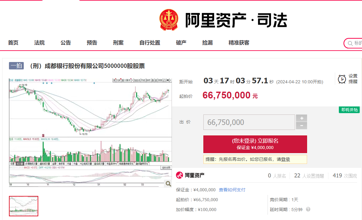 近日,湖南省长沙市中级人民法院在阿里司法拍卖平台上挂出拍卖公告,成都银行股份有限公司(下称成都银行)的10笔股权将于4月22日上午进行公开拍卖,合计5000万股股票,起拍价共计6.675亿元。