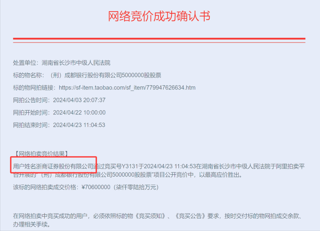 违规代持、涉刑资产、价值超过6亿,多个关键词的叠加,让涉及成都银行的这次拍卖尤为引人关注。截至11时左右,10笔拍卖全部成交,总成交价超过7亿元,其中大买主为浙商证券,以4.236亿元的代价共计拿到3000万股。股份成功过户后,该公司与另两家公司并列成都银行第十大股东。