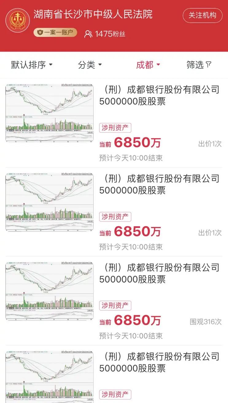 近日,湖南省长沙市中级人民法院发布拍卖公告,于2024年4月22日10时至2024年4月23日10时止(延时除外)在淘宝网络司法拍卖平台上进行公开拍卖活动,拍卖标的为成都银行股份有限公司5000万股股票。
