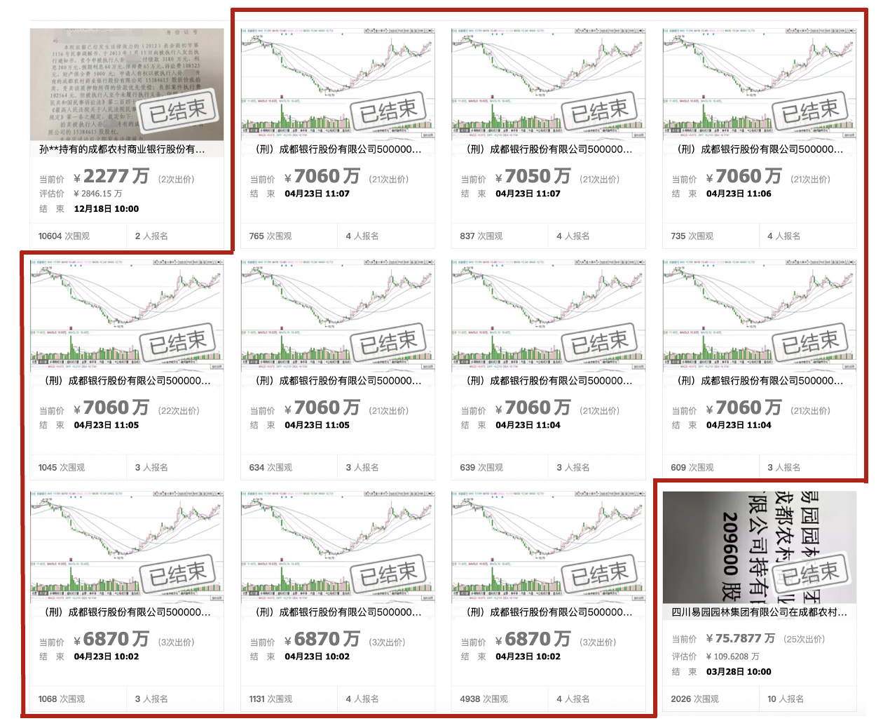4月23日,成都银行(601838.SH)、湖北银行的股权在阿里司法拍卖平台被拍卖。有人欢喜有人忧,成都银行5000万股股份被拍卖,最后竞拍总价约为7亿元。而湖北银行,却因无人出价,5993.9285万股股权一拍被流拍。