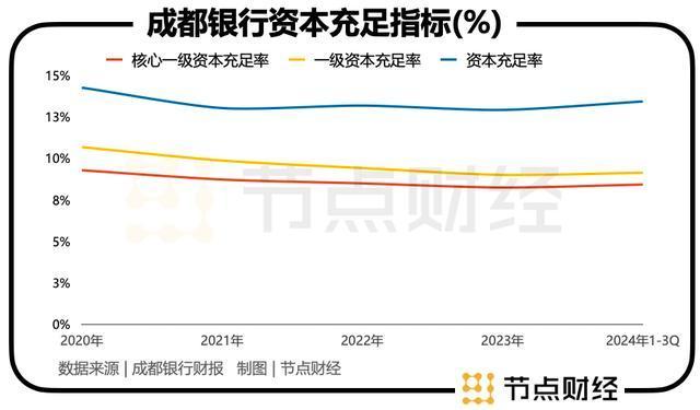 但随着身躯的膨胀,成都银行的资本金也在快速消耗。2024年前三季度,该行一级资本充足率、核心一级资本充足率、资本充足率依次为9.11%、8.40%、13.4%,处在行业中下游。