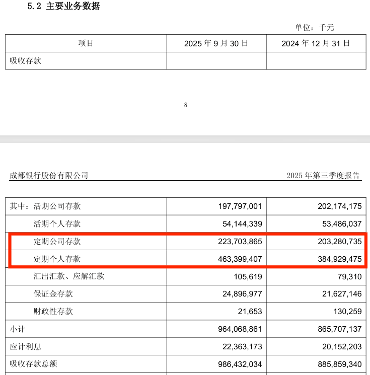公开信息还显示,在成都银行的负债中,存款占比超过77%。而存款中定期存款占比又特别高,超过了71%。