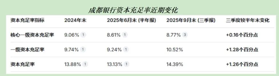 根据 国家金融监督管理总局 的规定,非系统重要性银行的核 心一 级资本充足率最低要求为7.5%。 成都银行 三季报8.77%的水平目前看是达标的。之所以被认为“偏低”,主要是因为在2024年末至2025年上半年期间, 成都银行 该指标经历了持续的下滑,导致安全垫变薄,引起了市场和监管对于其未来扩张能力和风险抵御能力的关注。