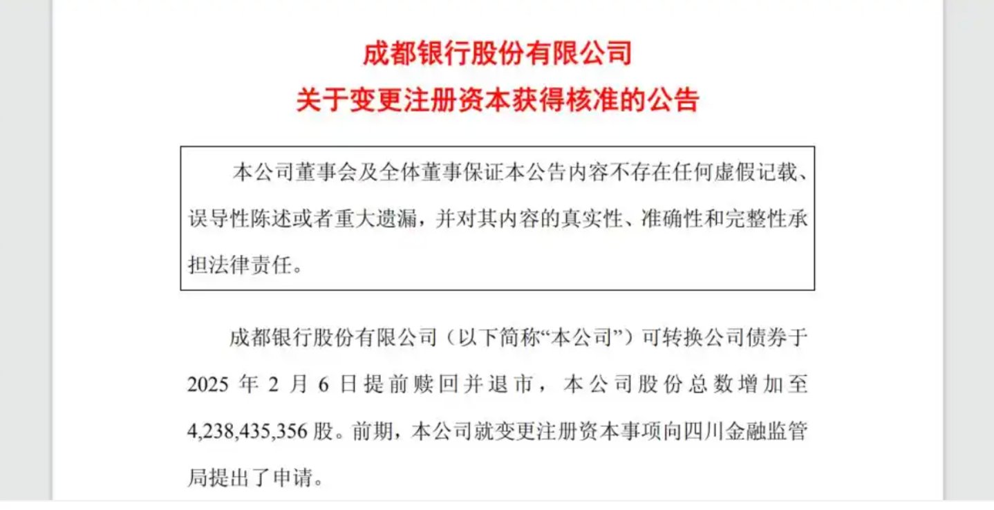不同于传统定增、配股等增资方式,成都银行此次注册资本扩容,核心驱动力是“成银转债”的提前赎回与高比例转股。