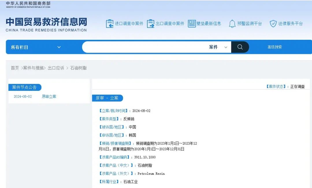 8月2日,韩国贸易委员会发布公告(案件调查23-2024-6)称,应韩国生产商韩国可隆工业株式会社于2024年5月31日提交的申请,对中国大陆和台湾地区石油树脂(Petroleum Resin)启动反倾销调查。