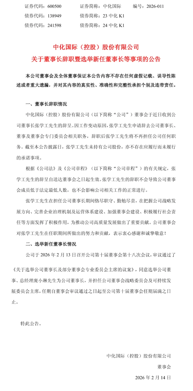 近日,中化国际发布公告称,因工作变动原因,张学工申请辞去公司董事长、董事及董事会专门委员会相关职务,辞职后张学工将不再担任公司任何职务;同日召开公司第十届董事会第十八次会议,同意选举公司董事、总经理庞小琳为公司董事长,并担任公司董事会战略委员会及可持续发展委员会主席。