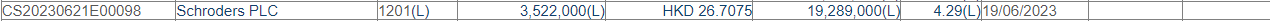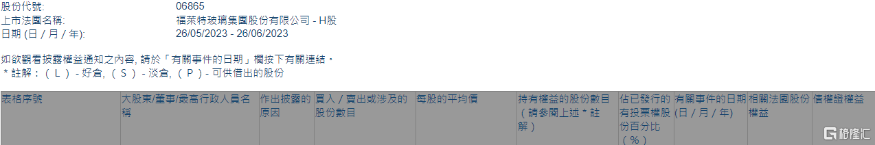 根据联交所最新权益披露资料显示,2023年6月19日,福莱特玻璃(06865.HK)遭Schroders PLC在场内以每股均价26.7075港元减持352.2万股,涉资约9406.38万港元。