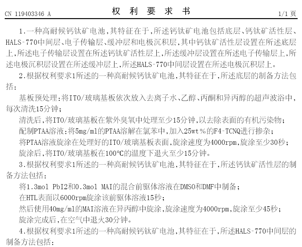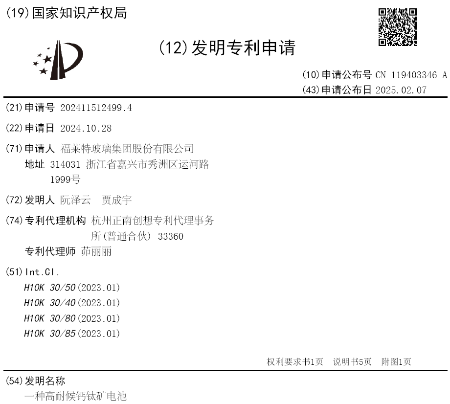 据国家知识产权局公开信息,近日,福莱特玻璃集团股份有限公司申请了一项名为一种高耐候钙钛矿电池的发明专利。专利申请号为CN202411512499.4,公开号为CN119403346A,公开日为2025.02.07。
