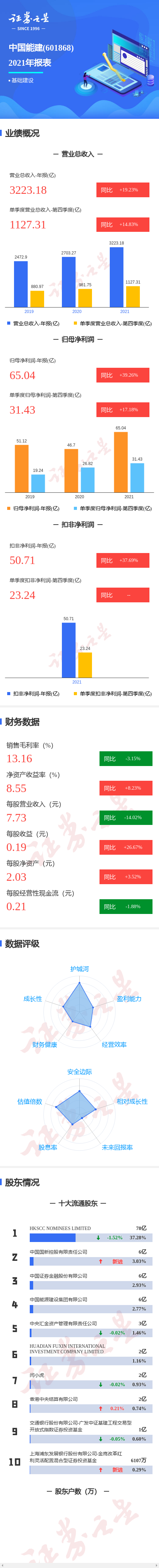 中国能建2021年报显示,公司主营收入3223.19亿元,同比上升19.23%;归母净利润65.04亿元,同比上升39.26%;扣非净利润50.72亿元,同比上升37.69%;其中2021年第四季度,公司单季度主营收入1127.31亿元,同比上升14.83%;单季度归母净利润31.44亿元,同比上升17.18%;单季度扣非净利润23.25亿元,负债率71.69%,投资收益4.72亿元,财务费用36.73亿元,毛利率13.16%。