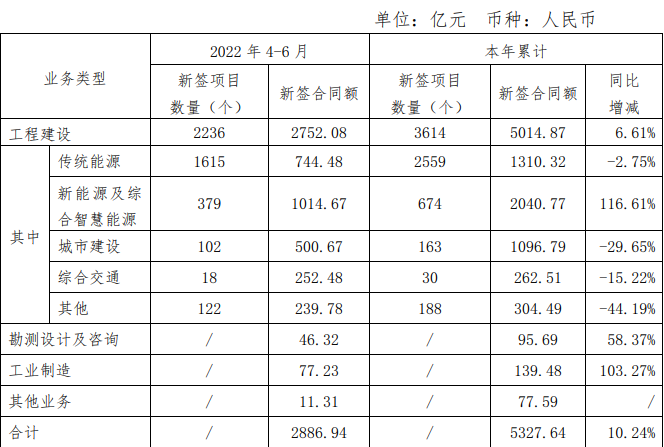中国能建7月8日公告,上半年累计新签合同额5327.64亿元,同比增长10.24%。具体情况如下图所示: