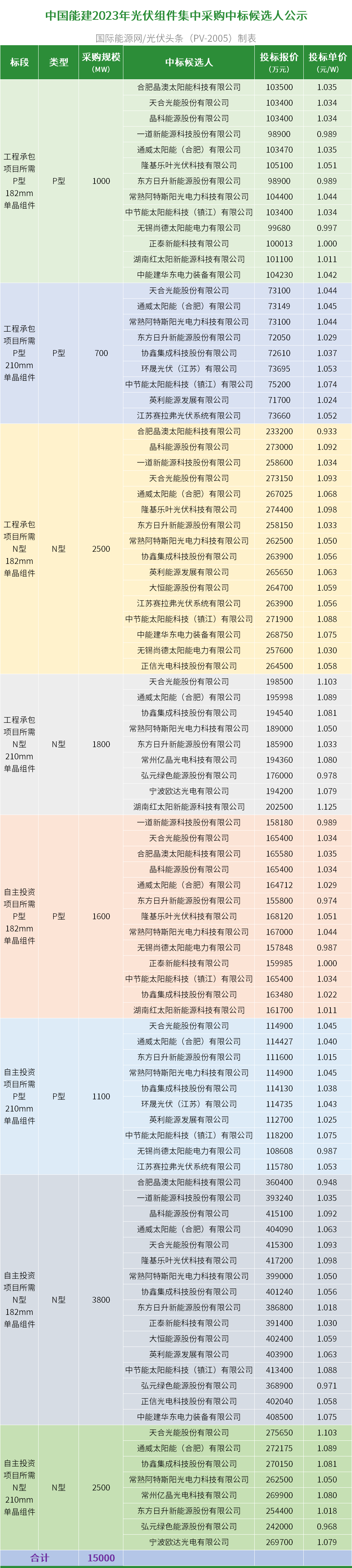 月12日,中国能建2023年光伏组件集中采购中标候选人公示。