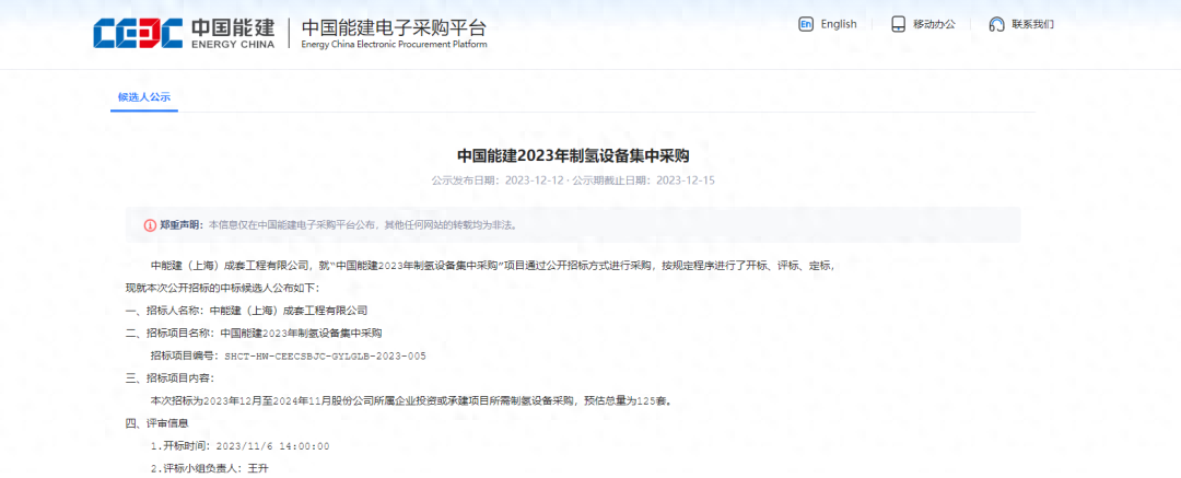 12月12日,中国能建2023年制氢设备集中采购项目发布中标候选人公告,10月11日,中国能建发布2023年制氢设备集中采购招标公告,预估总量为125套电解槽,氢云链获悉,其中200Nm3/h PEM电解槽15套,1000Nm3/h 碱性电解槽100套,总计515MW。
