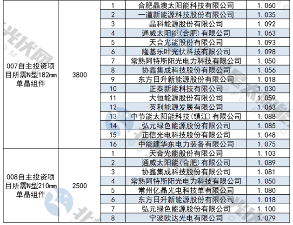 根据公告,本次招标为光伏组件采购预估总量为15000MW,项目主要分布于国内各施工现场。此次招标共分8个标段,招标组件类型为P型182mm/210mm单晶组件、N型182mm/210mm单晶组件,潜在投标人可以对某一标段或全部标段进行投标,兼投兼中。本次招标将确定中国能建2023-2024年光伏组件集中采购框架中标供应商,股份公司与中标供应商签订框架协议,框架协议有效期一年。中标候选人如下: