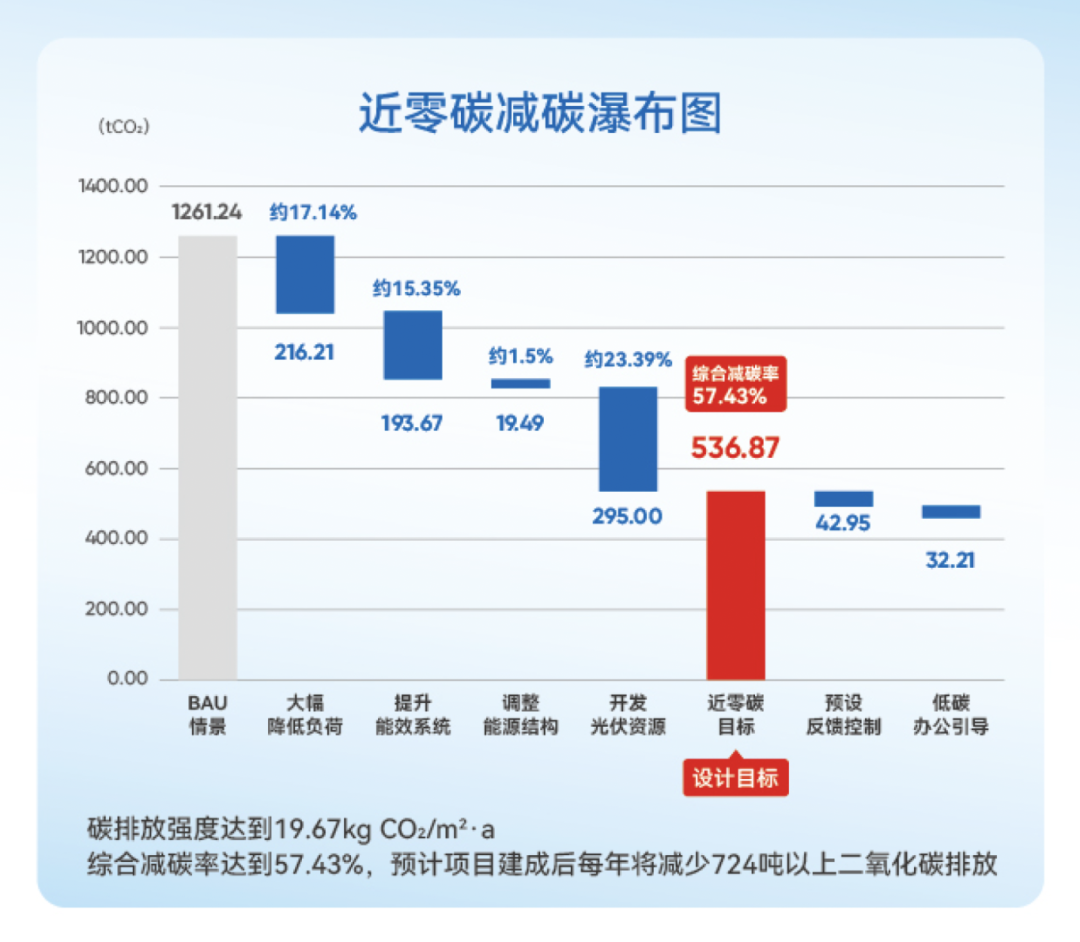 项目采用“大幅降低负荷、提升系统效率、调整用能结构、开发光伏资源、数据实时反馈、低碳办公引导”技术路线,进行建筑负荷和建筑用能双调节,实现建筑能耗和建筑碳排双控制。