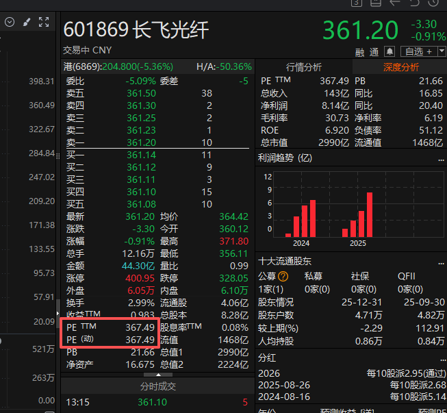 不过,想象力本身就是一种昂贵的杠杆。目前,长飞光纤的市盈率TTM已逼近400倍。