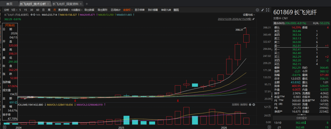 自去年12月起,长飞光纤的股价每个月都在刷新一次历史新高,从87.08元一路冲到今年4月的高位398.31元,短短不到5个月翻了4.6倍,直接把自己推成了“湖北首家2000亿市值企业”。