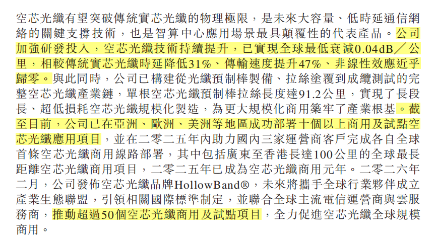 此外,长飞在财报中表示,公司已在亚洲、美洲、欧洲等地区部署10个以上商用及试点空芯光纤应用项目,并在推动超过50个空芯光纤商用及试点项目。