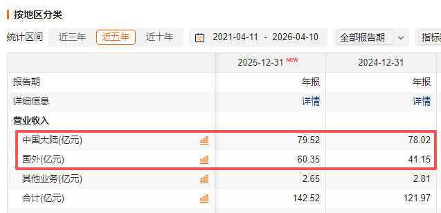 可能正因如此,长飞未来真正的增长空间,越来越不在国内,而在海外。这一点已经体现在财报里。2025年,长飞光纤的国外收入由2024年的41.15亿元大增至60.35亿元;相比之下,中国大陆收入只是从78.02亿元微增到79.52亿元。