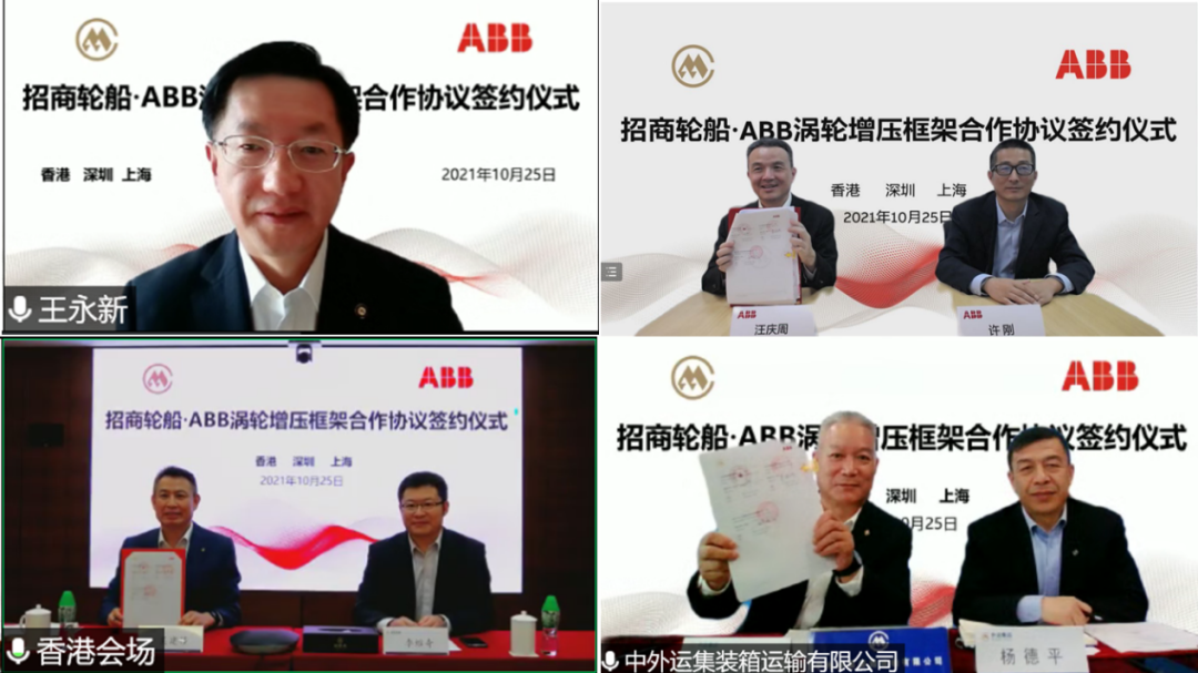 2021年10月25日下午,招商轮船与重庆ABB江津涡轮增压系统有限公司(以下简称“ABB涡轮增压”)举行框架合作协议云签约仪式。招商轮船总经理王永新出席仪式并致辞,招商轮船总轮机长吴建移、外运集运副总经理朱锦旗、ABB涡轮增压总经理汪庆周签署框架合作协议。