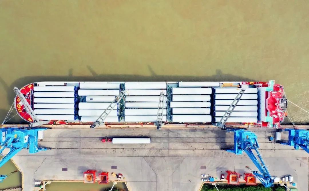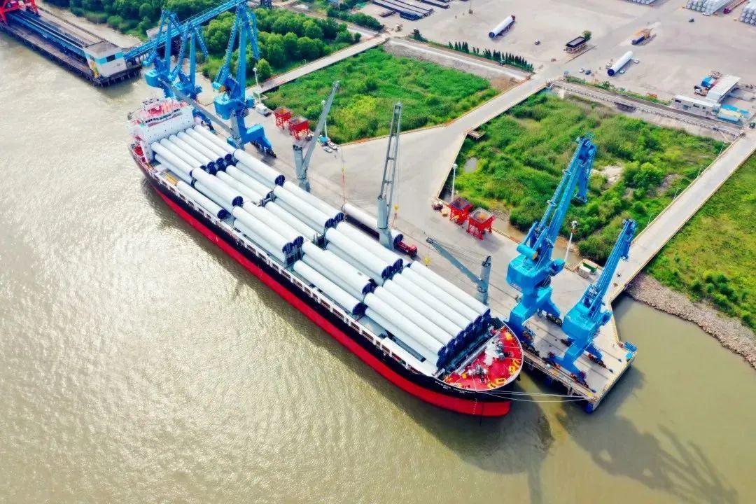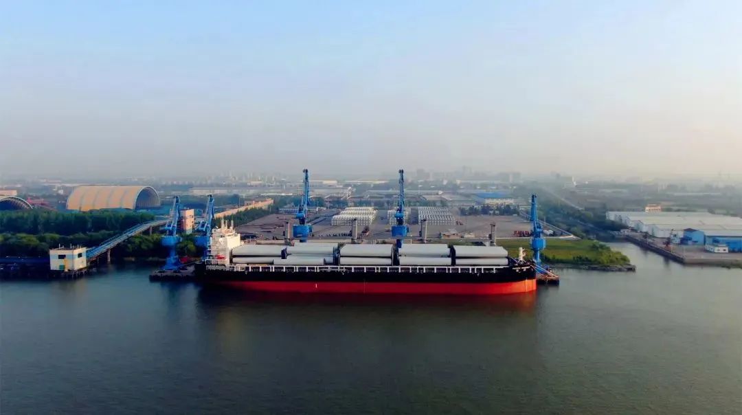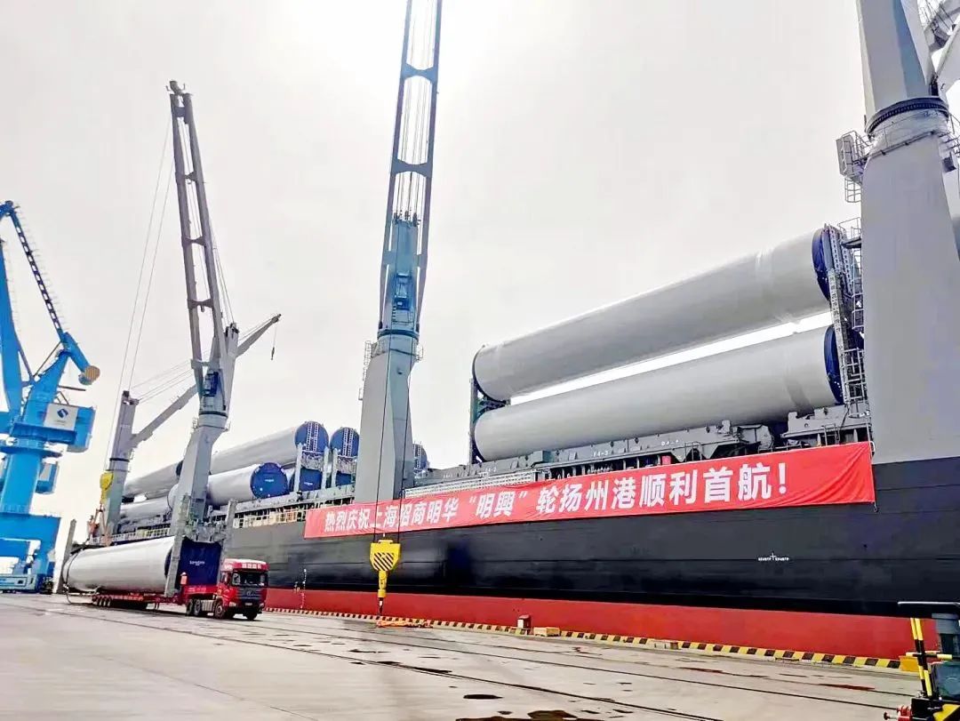 2022年5月16日,招商轮船全球最大多用途重吊船“明兴”轮在扬州港扬帆首航,满载28套VESTAS陆上风力发电机组塔筒、总计近6.2万立方米“扬州制造”的风电设备,驶往目的地澳大利亚。“明兴”轮首载量一举创下扬州港单船装载风电塔筒设备数量之最,受到央视等媒体的关注。