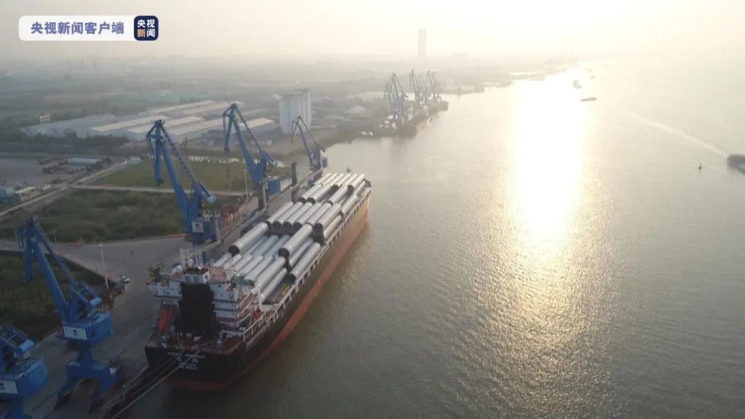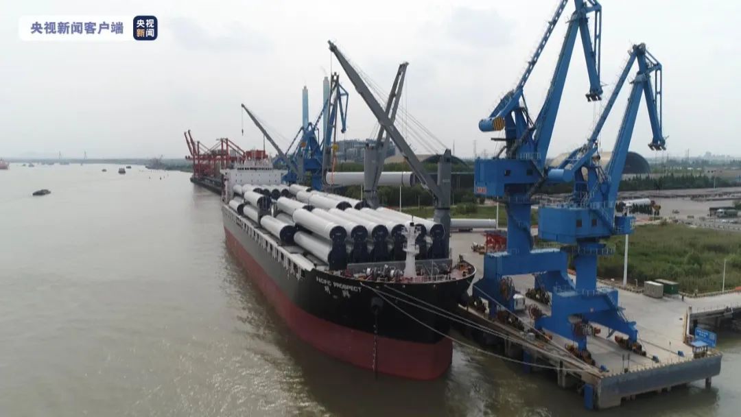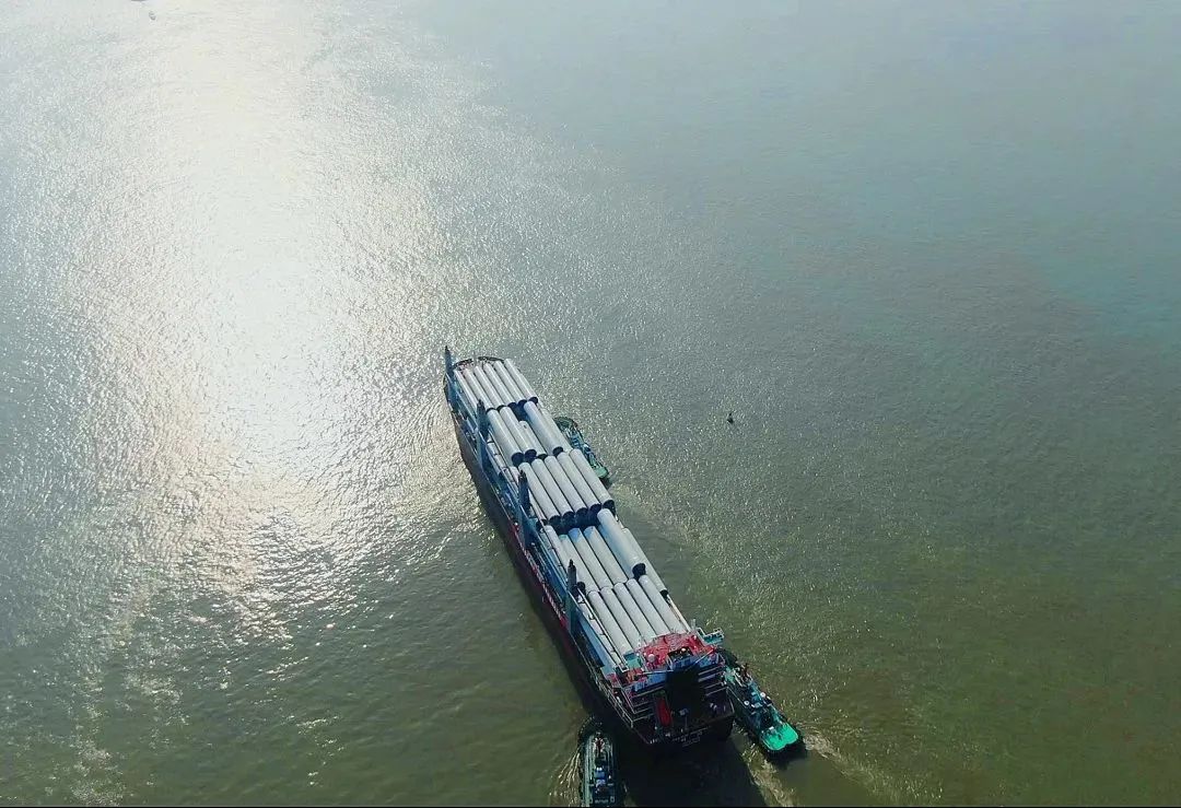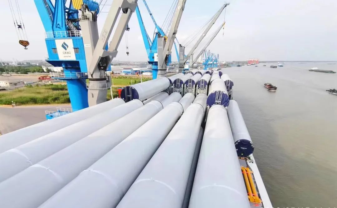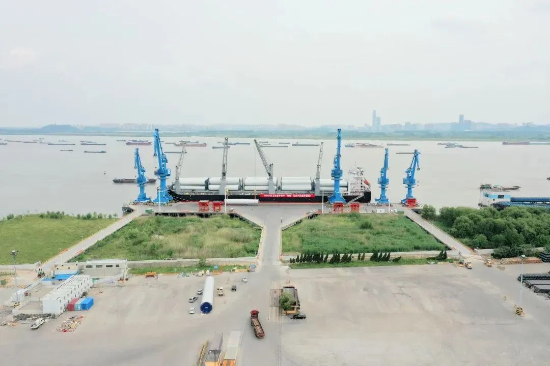 2022年5月16日,招商轮船全球最大多用途重吊船“明兴”轮在扬州港扬帆首航,满载28套VESTAS陆上风力发电机组塔筒、总计近6.2万立方米“扬州制造”的风电设备,驶往目的地澳大利亚。“明兴”轮首载量一举创下扬州港单船装载风电塔筒设备数量之最,受到央视等媒体的关注。