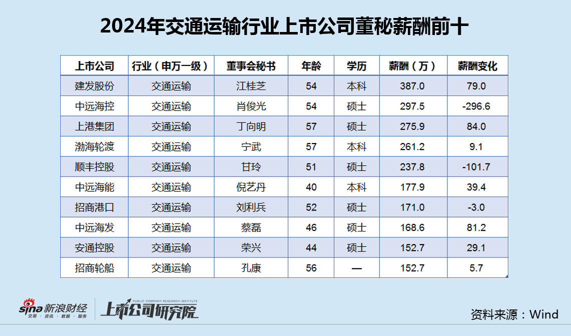 行业内,董秘薪酬前10位的上市公司分别为建发股份、中远海控、上港集团、渤海轮渡、顺丰控股、中远海能、招商港口、中远海发、安通控股和招商轮船。